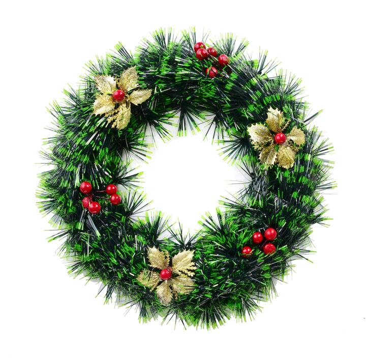 Tradiční vánoční věnec Ø 30 cm se zelenou základnou, zlatými květy a červenými bobulemi. Elegantní dekorace na dveře i stůl, která vnese do domova hřejivou atmosféru.