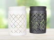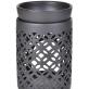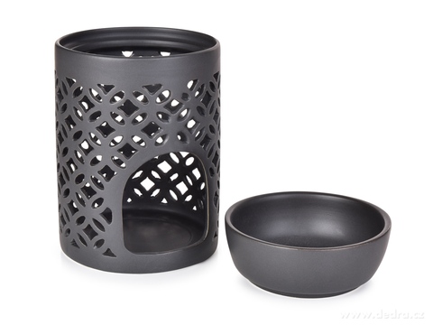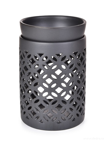 Designová aromalampa VIREA v matné černé keramice s geometrickým krajkovým dekorem a odnímatelnou miskou. Promítá působivé světelné obrazce. Pro vosky a esence PARFUMIA®. Ø 8 cm, výška 13 cm. Moderní a výrazná.