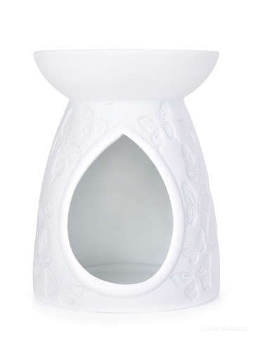 Keramická aromalampa PAPILLIA s embosovaným motivem motýlů v matné bílé glazuře promítá po zapálení svíčky jemné světelné efekty. Vhodná pro vosky a esence PARFUMIA®. Průměr 9,5 cm, výška 12 cm. Romantická a něžná.