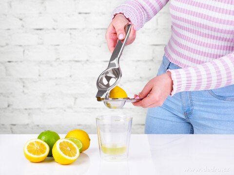 Ruční pákový odšťavňovač CITRÓNOVNÍK z nerezové oceli, délka 20 cm, pro rychlé a důkladné lisování citrónů a limetek bez pecek a dužiny.