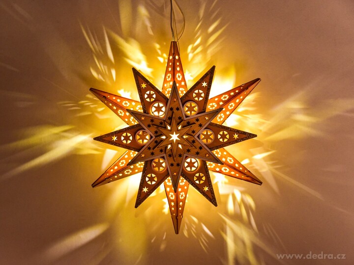 Elegantní závěsná dřevěná hvězda s LED osvětlením vnese do interiéru pocit klidu a pohody. Díky oboustrannému provedení září ze všech stran a vytváří prostorový světelný efekt, který krásně rozzáří místnost i zimní večery.