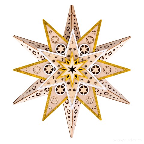 Oboustranná dřevěná LED dekorace HVĚZDA TICHA s prostorovým světelným efektem a průměrem 30 cm rozzáří okna i výklenky jemným třpytem a vánoční atmosférou.
