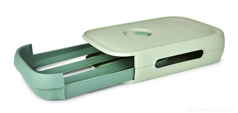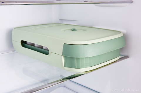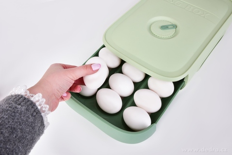 Stohovatelný samospádový box na 18 vajec s výsuvným šuplíkem, cirkulací vzduchu a mechanickou datumovkou. Udrží vejce déle čerstvá, chráněná a perfektně zorganizovaná v lednici.