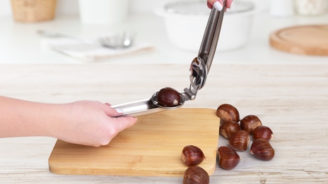 CHEF 2v1 – nerezový louskáček a kleště na ořechy i jedlé kaštany. Robustní konstrukce, ergonomický úchop, plastové otvírátko na kaštany. Vhodný na ořechy různých velikostí.