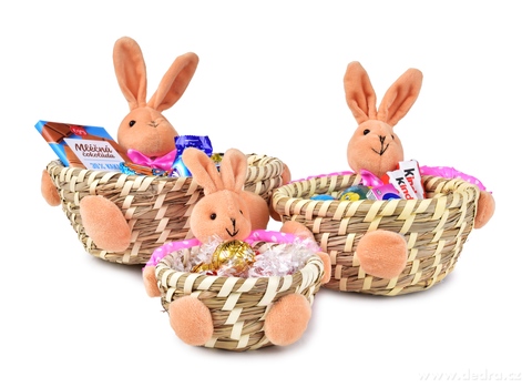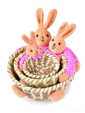 Krásná velikonoční dekorace z přírodní slámy a textilu, kterou můžeš dozdobit svazky dekorativní trávy nebo do ošatek připravit dobroty pro koledníky.