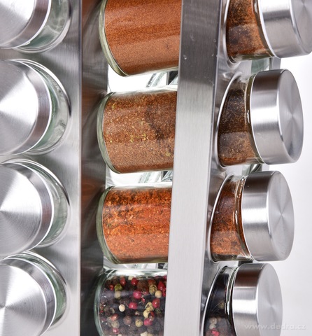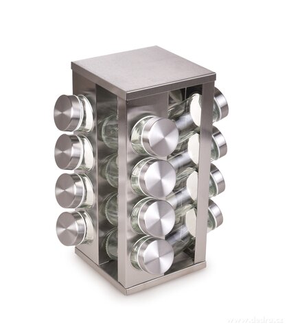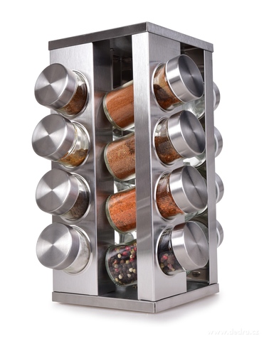 KOŘENKOVÝ KOLOTOČ otočný stojan z broušené nerezové oceli se skleněnými kořenkami. Stojan: š 12,5 x h 12,5 cm x v 27,5 cm, kořenka: průměr cca 4 cm x výška 9,7 cm (objem jedné dózy cca 90 ml).