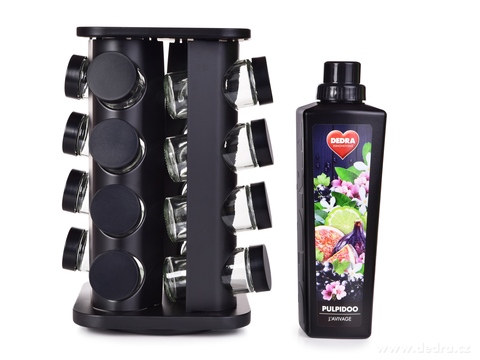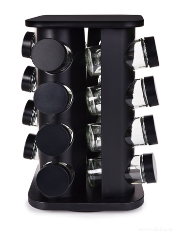KOŘENKOVÝ KOLOTOČ otočný stojan z broušené nerezové oceli s černou povrchovou úpravou se skleněnými kořenkami. Stojan: š 15,8 x h 15,8 cm x v 28 cm, kořenka: průměr cca 4 cm x výška 9,7 cm (objem jedné dózy cca 90 ml).