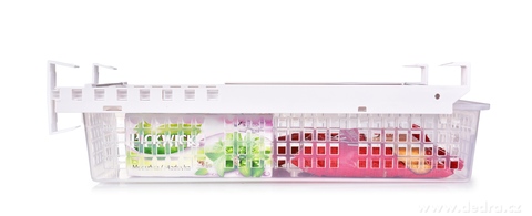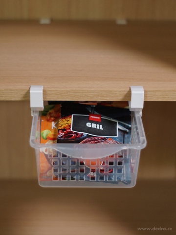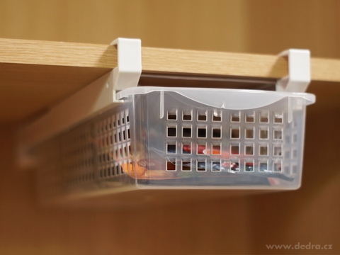 Závěsný výsuvný košík, jednoduché nasazení na poličku. Nosnost cca 6 kg.