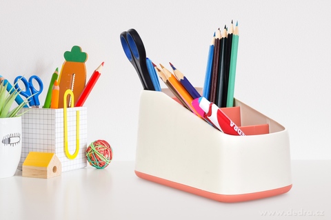 Kancelářský organizér se čtyřmi přihrádkami pro uložení per, tužek, poznámek, kalkulačky, nůžek a dalších psacích potřeb. Vyrobeno z odolného plastu.