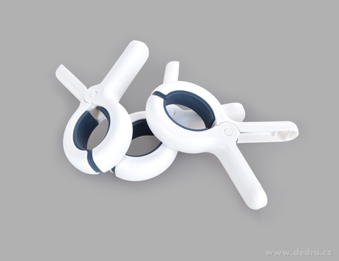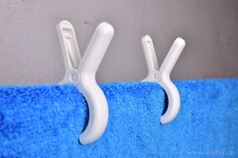 Sada 3 MAXIKOLÍČKŮ na objemný textil ideální k uchycení dek, přikrývek nebo ručníků. Pevný plast, kovová pružina a vnitřní soft touch silikon zajišťují šetrné a spolehlivé připevnění. Perfektní na lehátka, šňůry i širší tyče – ideální na dovolenou i kempování.