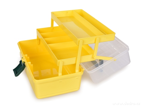 Praktický úložný kufr PRAKTIK se sklopnou rukojetí. Nabízí 1 velký prostor a 2 výsuvné přihrádky pro nářadí, šroubky, hobby potřeby či kosmetiku. Pevný plast, průhledné víko a snadné přenášení. Rozměr 34 × 21,5 × 17,5 cm.