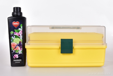 Žluté úložné pouzdro se sklopnou rukojetí, zapínání na jednu přezku. Vyrobeno z pevného plastu.