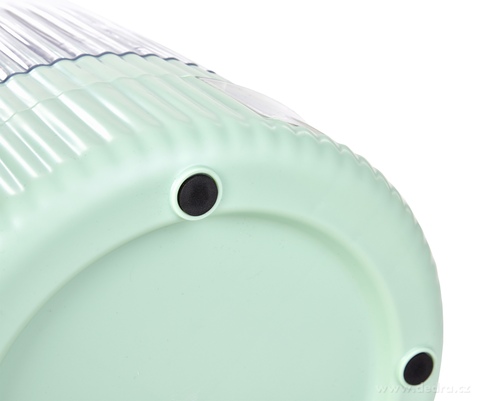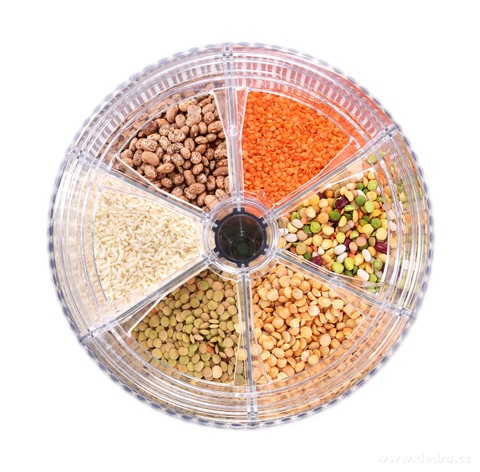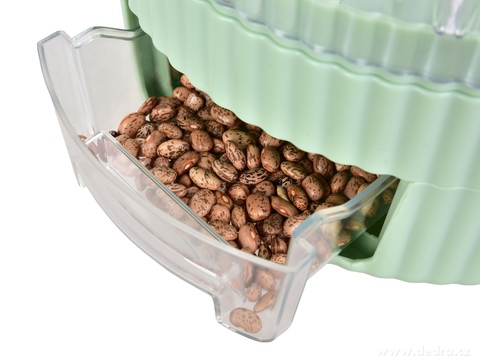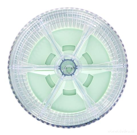 360° otočný dávkovač na sypké potraviny se 6 přihrádkami, vyrobený z pevného plastu.