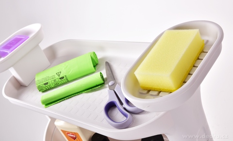 Víceúčelový pojizdný regál PRAKTIK se 4 policemi a vyjímatelným 15L kbelíkem. Ideální na úklidové potřeby, praní i skladování. Snadno přemístitelný díky kolečkům, pevný plast, praktické boční police a univerzální využití.