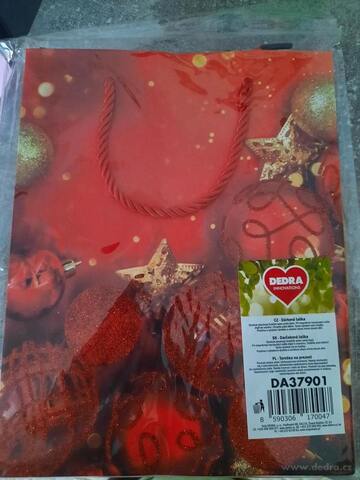 Zářivý balicí detail, který dělá radost ještě dřív, než se dárek rozbalí. Stylová taška s motivem červených vánočních koulí je na jedné straně jemně posypaná zlatými třpytkami, které jí dodávají slavnostní šmrnc.