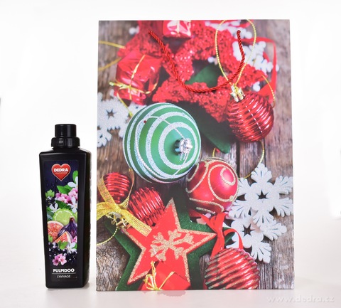 Velká vánoční dárková taška s motivem červených a zelených ozdob, zlatě třpytivými detaily a provázkovým uchem. Pevný karton, ideální na větší dárky. Rozměry 30 × 12 × 41 cm.