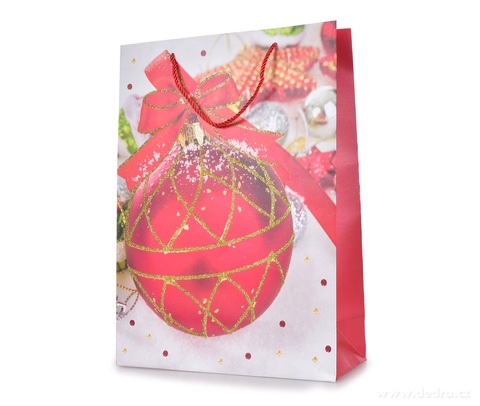 Luxusní dárková taška s červenou vánoční koulí zdobenou zlatými třpytkami a saténovou mašlí. Bílé pozadí s puntíky a červené bočnice dodají slavnostní vzhled každému dárku. Velikost XL – ideální pro opravdu velké překvapení.