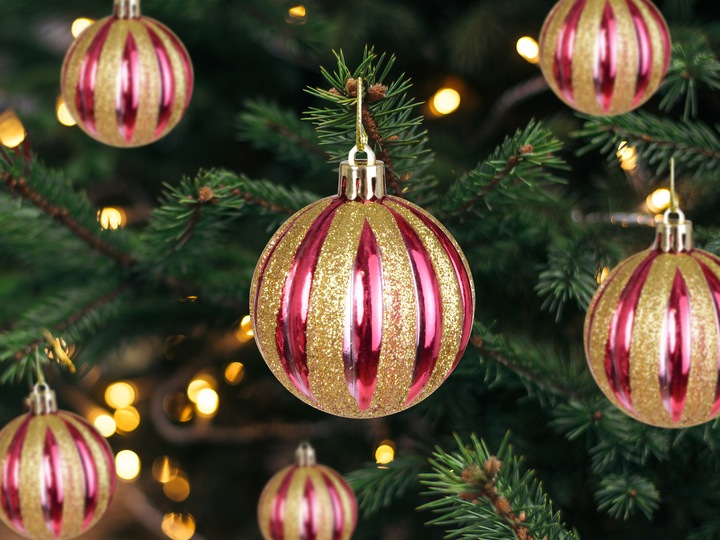 Sada 6 červených koulí se svislými zlatými třpytivými pruhy. Elegantní, lesklé a bezpečné ozdoby o průměru 6 cm. Skvělý doplněk klasické i moderní vánoční výzdoby.