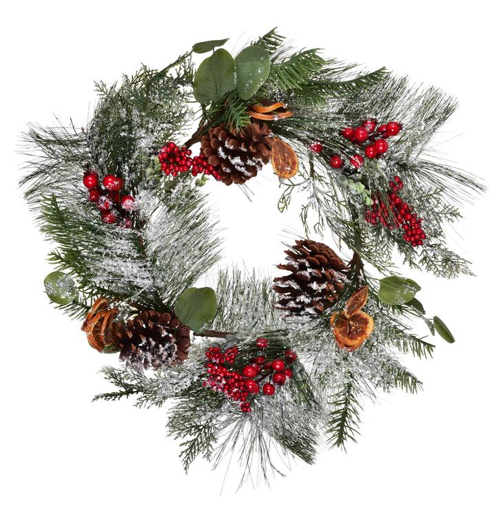 Luxusní vánoční věnec ZASNĚŽENÉ BOBULE o průměru 40 cm s jehličím, bobulemi, šiškami a sušenými pomeranči. Bohatá dekorace na dveře, stůl či krb s jemným zasněženým efektem.
