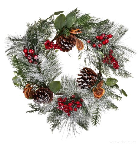 Tento XL dekorativní věnec přináší do interiéru i exteriéru atmosféru zimní pohádky. Kombinace sytě červených bobulí, přírodních šišek, sušených pomerančů a zasněženého jehličí vytváří bohatý a harmonický celek, který rozzáří každý prostor.