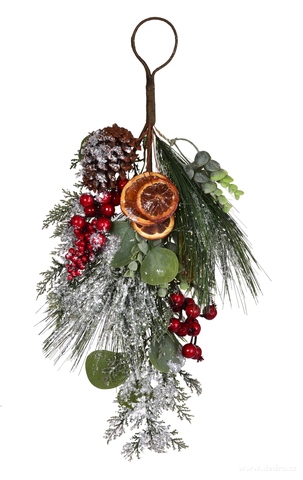 Tato závěsná větvička s délkou 50 cm vnese do vašeho domova vůni zimního lesa a hřejivý pocit tradice. Bohatá kombinace zasněženého jehličí, červených bobulí, přírodní šišky a sušeného pomeranče působí slavnostně a přirozeně zároveň. Jemný třpyt evokuje čerstvě napadaný sníh, který ozdobí každý detail.
