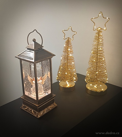 LED lucerna SVĚTLO ANDĚLSKÉ NADĚJE s andělem a poletujícími třpytkami. Hraje 8 vánočních melodií, svítí teplým světlem. Výška 31 cm, napájení bateriemi nebo USB. Symbol klidu a vánoční naděje.