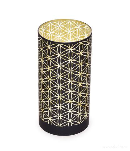 Designový skleněný svícen ORIONEA s LED osvětlením, matně černým povrchem a zlatým geometrickým dekorem. Výška 20,5 cm, průměr 10 cm. Stylová dekorace pro moderní interiér.