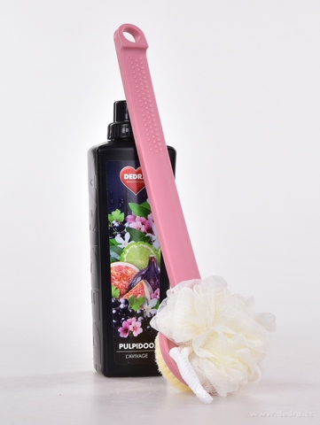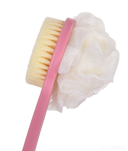 SPA 2v1 kartáč + puff na mytí zad v růžové barvě. Oboustranný pomocník s dlouhou rukojetí 37 cm, kartáč pro jemný peeling a masáž, puff pro bohatou pěnu. Praktický doplněk pro každodenní sprchu i koupel.