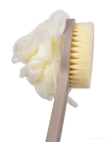 SPA 2v1 oboustranný kartáč + puff na mytí zad v přírodní barvě. Dlouhá rukojeť 37 cm, kartáč pro jemnou masáž a peeling, síťovaný puff pro bohatou pěnu. Elegantní a praktický doplněk pro každodenní sprchu i koupel.