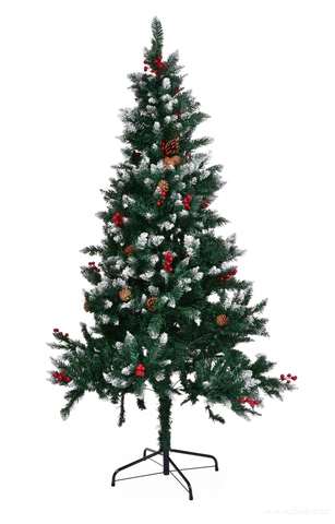 Realistický vánoční stromek smrk se šiškami, hlohem a sněhovým popraškem, vysoký 210 cm. Ohebné větvičky pro snadné tvarování, stabilní kovový stojan a dlouhá životnost bez opadávání jehličí.