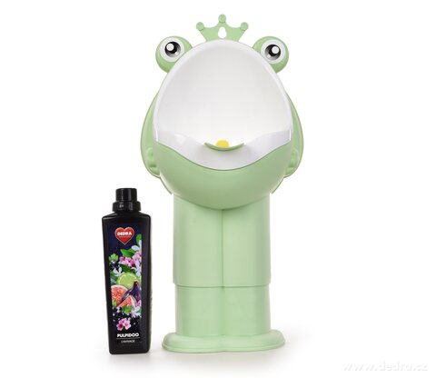 ŽABÁK závěsný a stojící pisoár pro chlapce s háčkem pro pověšení na zeď, s nastavitelným stojanem a odpadní trubkou, vyjímatelná vnitřní plastová nádrž s vrtulkou (objem cca 1 l). Vyrobeno z pevného plastu.