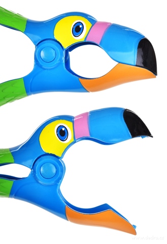 Sada 2 kovových klipů TUKAN PEPAN na připevnění plážových osušek k lehátku nebo šňůře. Veselý motiv tukana usnadní identifikaci osušky, zabrání jejímu sklouznutí či uletění ve větru. Praktický stylový doplněk k bazénu, na pláž i dovolenou.