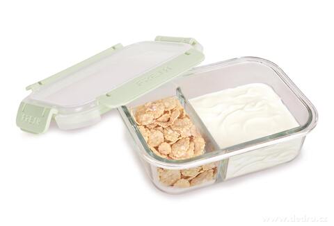 Díky silikonovému těsnění a uzavíratelným klipsům zůstane obsah bezpečně uvnitř – neotevře se a nevysype. Skleněná dóza na potraviny FRESH GLASS má dvě samostatné přihrádky (150 ml a 250 ml) pro praktické oddělení různých druhů jídel.