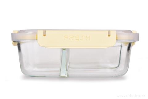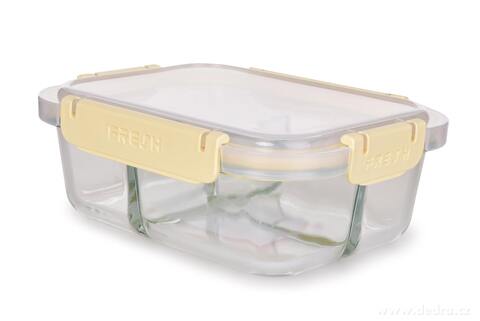 Díky silikonovému těsnění a uzavíratelným klipsům zůstane obsah bezpečně uvnitř – neotevře se a nevysype. Skleněná dóza na potraviny FRESH GLASS má tři samostatné přihrádky (200 + 200 + 300 ml), takže můžete pohodlně oddělit hlavní jídlo od příloh či dezertu.
