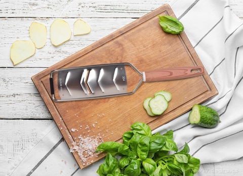 Ruční struhadlo CHEF na plátky z odolné nerezové oceli s protiskluzovou podporou a rukojetí imitující dřevo. Ostré čepele pro snadné krájení ovoce, zeleniny, sýrů i čokolády.