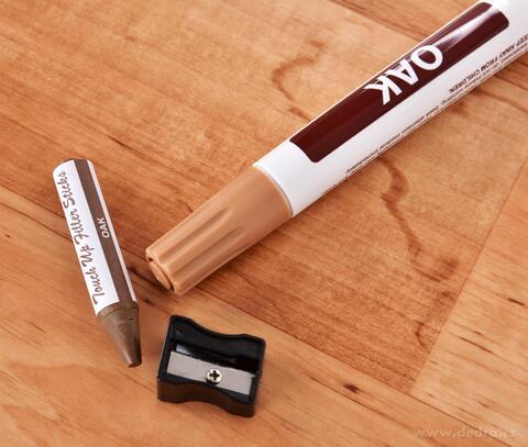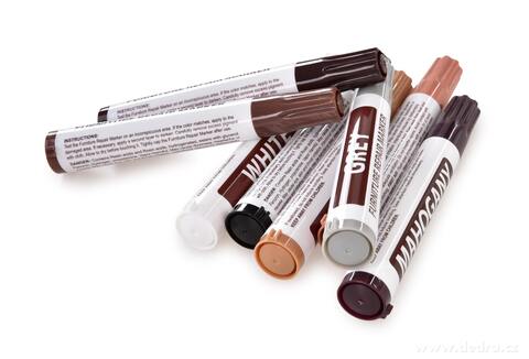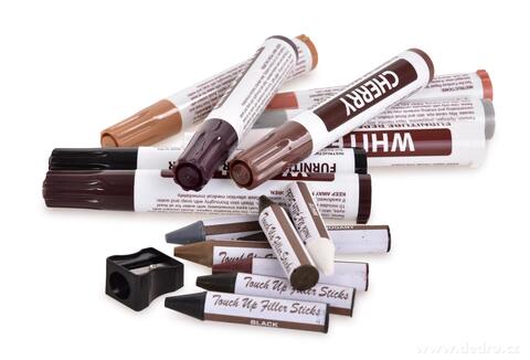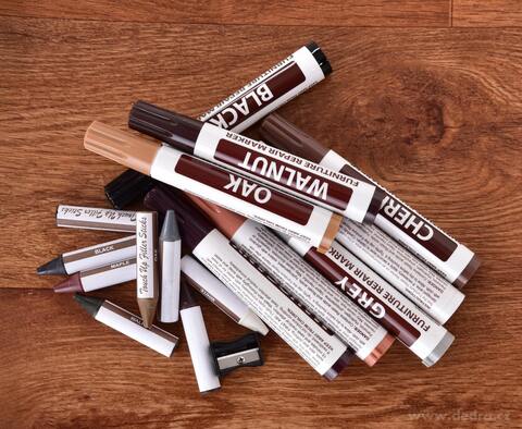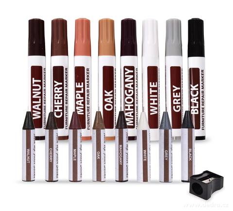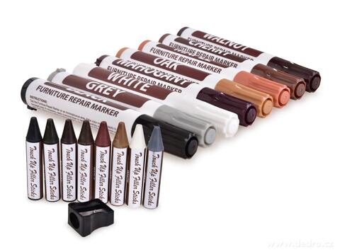 17dílná sada korektorů na nábytek. Sada obsahuje 8 fixů, 8 vosků v 8 barvách (černá, šedá, bílá, mahagon, javor, dub, třešeň, ořech) a ořezávátko.