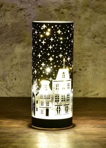 ZIMNÍ MĚSTEČKO je větší verze oblíbeného svícnu, která vnese do vašeho interiéru pohádkovou atmosféru zimního večera. Matné zelené sklo s jemným povrchem zdobí detailní motiv malebného městečka pod hvězdným nebem.