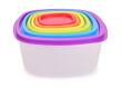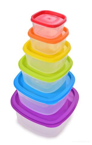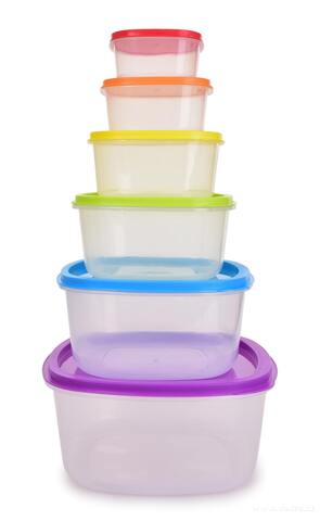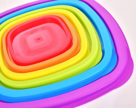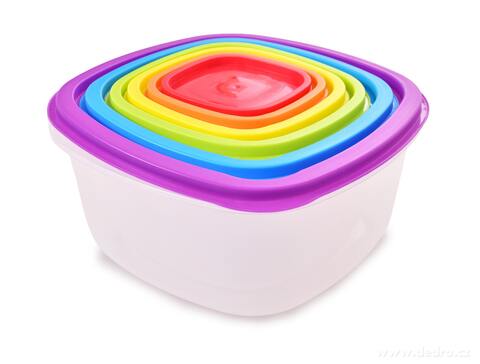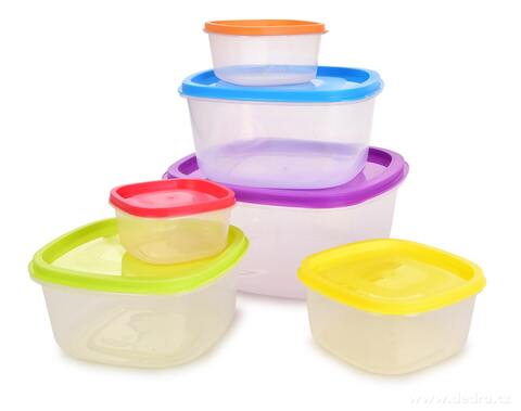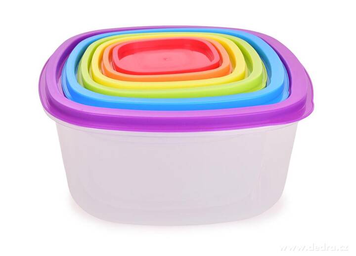 Praktická sada 6 plastových dóz s barevnými víky na uchovávání, přenášení a mražení potravin. Úsporně se skládají jedna do druhé, vhodné do myčky, mikrovlnky i mrazničky – ideální pro krabičkové diety a domácí skladování.
