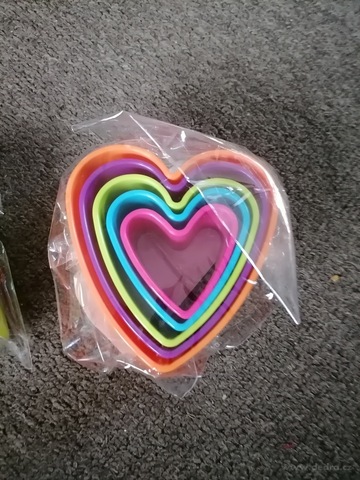 Sada 5 vykrajovátek CREMO ve tvaru srdíček, délka 5–10 cm, výška 4 cm. Odolný plast v mixu barev, ideální na cukroví, ovoce, zeleninu i piškoty.