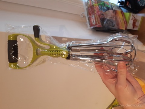 Výška: 34 cm, délka metliček: 16 cm, průměr metliček: 5 cm. Materiál: odolný plast a nerez, TPR protiskluzová rukojeť a klička. Můžete použít k lepšímu rozšlehání mouky ve smetaně, mléce nebo vodě na zahuštění pokrmů (nahrazuje klasickou ruční kvedlačku), k našlehání sušené syrovátky.