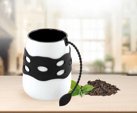 HRNEK S PROTISKLUZOVÝM SILIKONOVÝM PÁSKEMa silikovým sáčkem na sypané čaje. Lesklé provedení vnitřní barevné stranya krásný kontrast bílého vnějšku. Max. objem: 380 ml.Rozměry: 9 x 9 x 11 cm, sítko: 23 x 6 x 2,5 cm.Materiál: kamenina s vnitřní barevnou lesklou glazurou + silikon.Možno mýt v myčce nádobí.