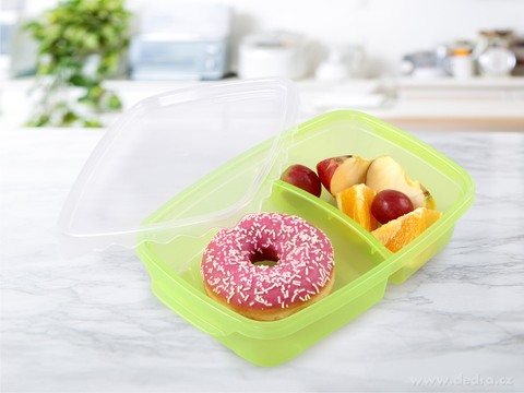 Praktický DUOBOX na potraviny dělený na 500 ml a 300 ml pro nošení obědů a svačin do práce. Odolný plast vhodný do myčky, mikrovlnky i mrazničky. Ideální pro krabičkové diety, uchování a přenášení čerstvých i vařených jídel.