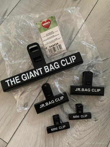 5 ks sada KLIPSY různých velikostí na uzavírání sáčků s efektními nápisy, vyrobeny z odolného plastu.