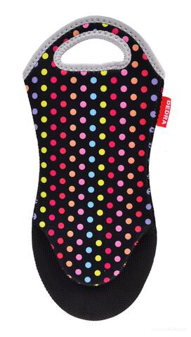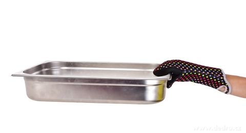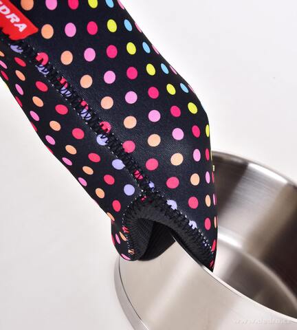 Odolná TERMOCHŇAPKA z neoprenu s barevnými puntíky. Univerzální pro levou i pravou ruku, protiskluzový povrch, prodloužená délka chrání i předloktí. Odolná do 260 °C, pratelná na 30 °C. Rozměr 14 × 33 cm.