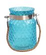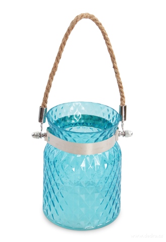 Zahal svůj prostor romantickým barevným světlem. Elegantní design do moderního i klasického interiéru. Lze použít i jako vázu pro živé květiny či suchá aranžmá. Skleněný modrý svícen s lanovým uchem na přenášení, na čajovou nebo menší válcovou svíčku, reliéfní povrch. Rozměry: výška 15 cm, spodní průměr 12 cm, horní průměr 10 cm. Materiál: skl...