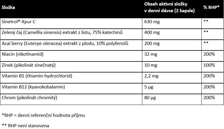 Sinetrol® doplňuje extrakt ze zeleného čaje s vysokým obsahem katechinů, jejichž účinky na snížení hmotnosti jsou také prokázány. Pro další podporu metabolismu živin jsou do komplexu přidány vitamíny B1, B3, B12, zinek a chrom. Celá směs tak může nabídnout synergický efekt na hubnutí. Jako bonus je v našem produktu obsažen extrakt z acai berry, který je významným zdrojem antioxidantů, a také dalších vitamínů či stopových prvků. Komplex je ideální pro každého, kdo hledá účinnou podporu při snaze dosáhnout optimální tělesné hmotnosti.