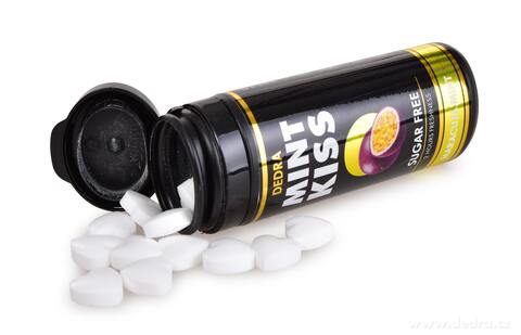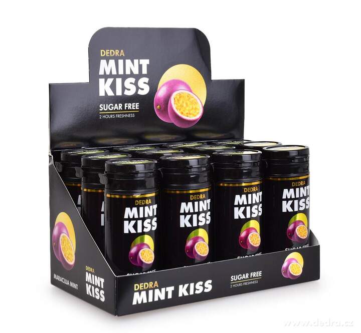 Sada 12 ks mátové osvěžující pastilky bez cukru MINT KISS, maracuja mint, 28 g x 12.