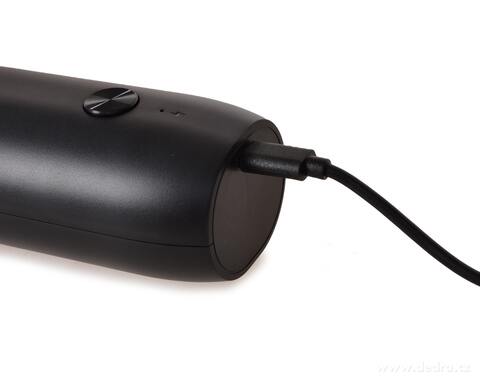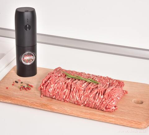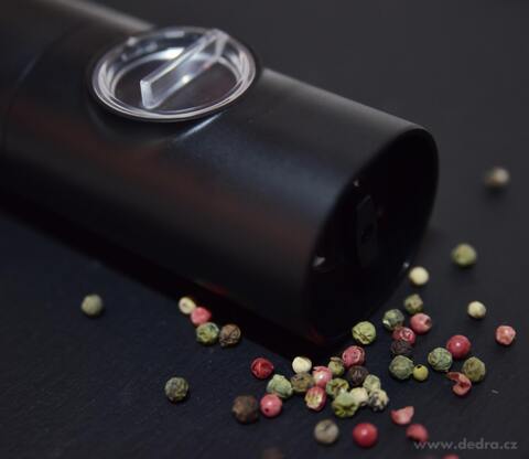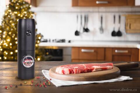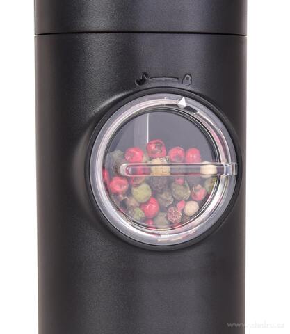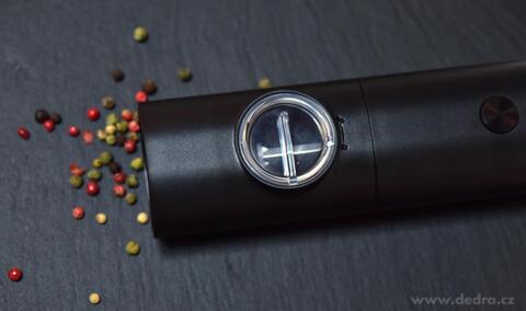 Moderní elektrický mlýnek NEMO na pepř, sůl a koření s dobíjením přes USB-C. Ovládání jednou rukou, elegantní kombinace nerezu a plastu, snadné doplňování a čištění.