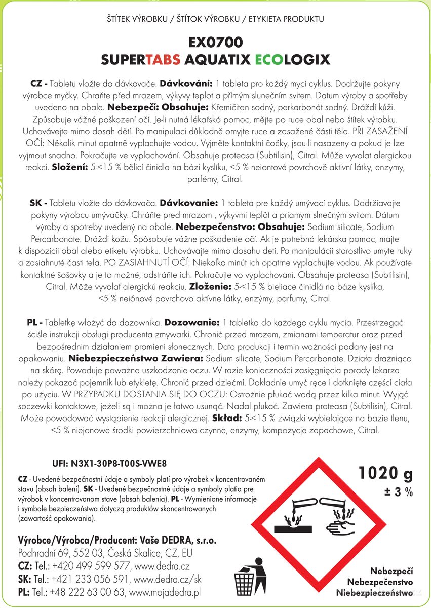 AQUATIX® ECOLOGIX SUPERTABS jsou moderní multifunkční tablety do myčky s novým složením na bázi přírodních a biologicky odbouratelných tenzidů. Obsahují nejnovější enzymy, které zvyšují účinek mytí a až o 100 % lépe odstraňují skvrny od čaje a kávy. Ekologické a přitom vysoce účinné – testy potvrdily, že jsou srovnatelné nebo lepší než prémiové ne-eko značky ze supermarketů.
