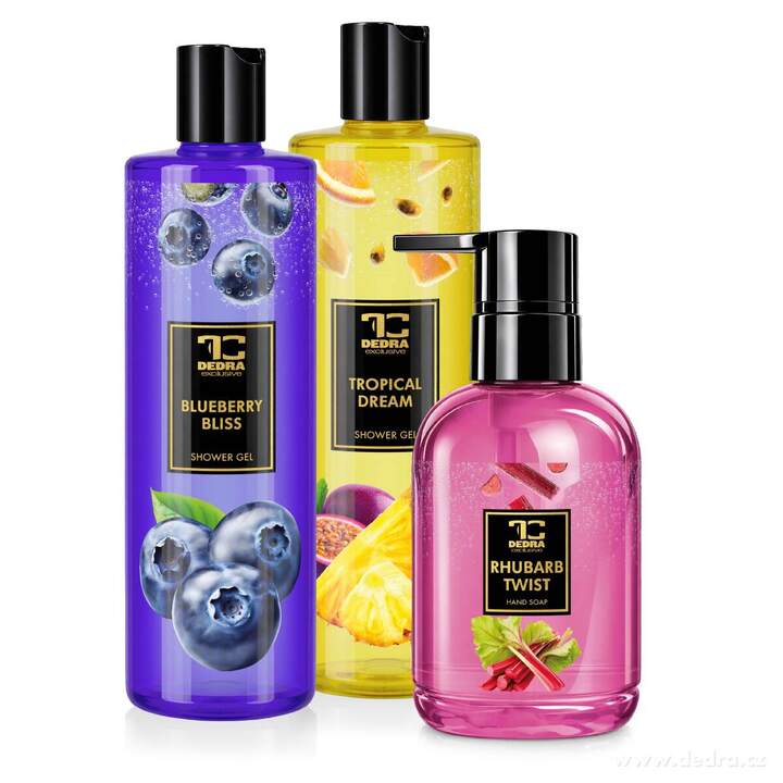 Sada FRUITY 2+1 – sprchové gely BLUEBERRY BLISS a TROPICAL DREAM a tekuté mýdlo RHUBARB TWIST. Ovocná péče, která přináší svěžest a lehkost do každodenní hygieny. Jemně čistí pokožku a zanechává příjemný pocit komfortu.
